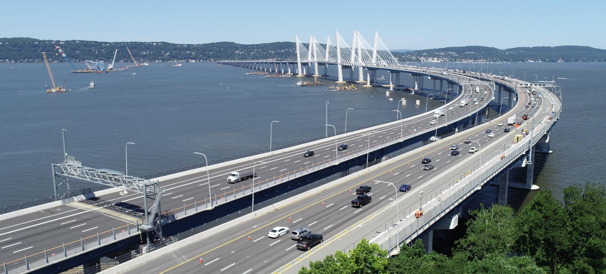 The Governor Mario M. Cuomo Bridge carries the Thruway, Interstate 87, and Interstate 287 over the Hudson River between South Nyack, Rockland County, New York and Tarrytown, Westchester County, New York. The new bridge was opened to traffic in 2018 and was designed and constructed to last 100 years without major structural maintenance.